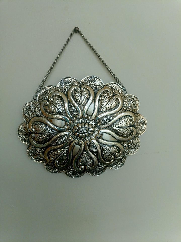 Boyu 15 cm eni 11,5 cm. 900 ayar 40 senelik gümüslük içinde muhafaza edilmiştir. sarı ışık yansıma yapmıstır.