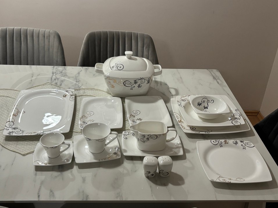 12 kişilik kütahya porselen yemek takımı 12 servis tabağı 12 tatlı tabağı 12 yemek tabağı 12 kase 6 kahve fincanı ve tabağı 6 büyük fincan ve tabağı 2 küçük kayık tabak 1 büyük kayık tabak 2 tuzluk 2 karabiberlik 1 sosluk ve tabağı 1 çorbalık Eksiksiz tam takımdır bi kaç tabakta hafif silinme oldu