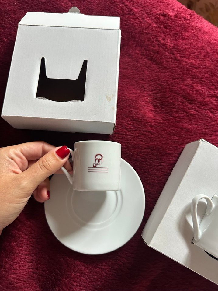Küçük Türk kahvesi porsiyonları için beyaz porselen fincan ve tabak seti, üzerinde küçük kahverengi logo bulunur