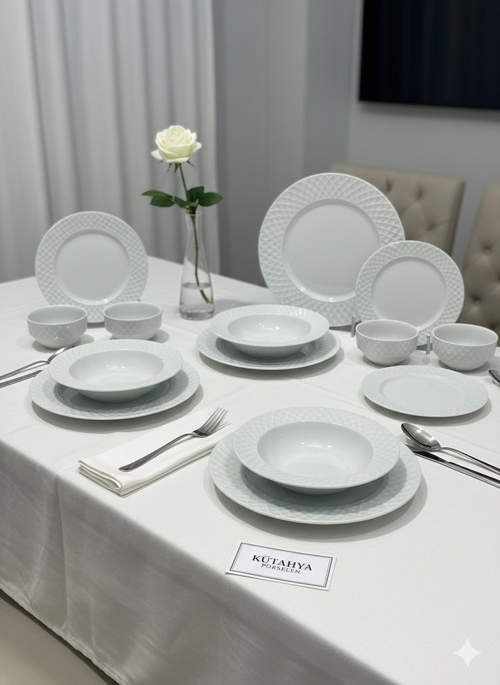 Kütahya Porselen beyaz yemek takımı, gri desenli tabaklar, kaseler ve fincanlar içerir. Şık sofralar için uygundur. ️