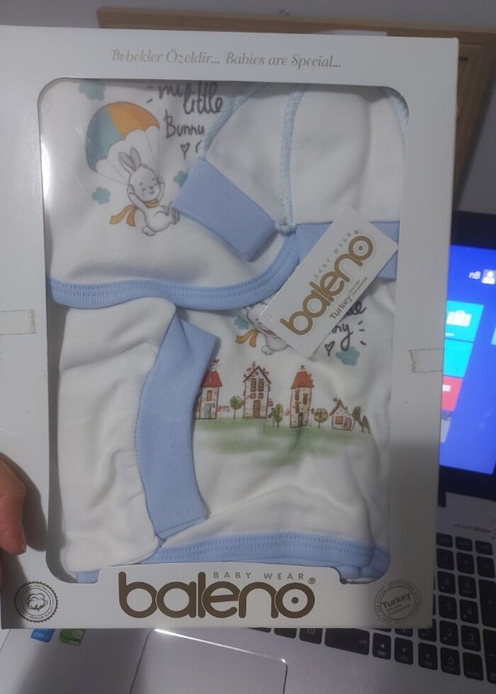 Hediyelik olarak tercih edebileceğiniz, kutu içerisinde eldiven, yakalık, şapka ve patikli alt ve çıtçıtlı üst bulunan bebek yenidoğan takımı