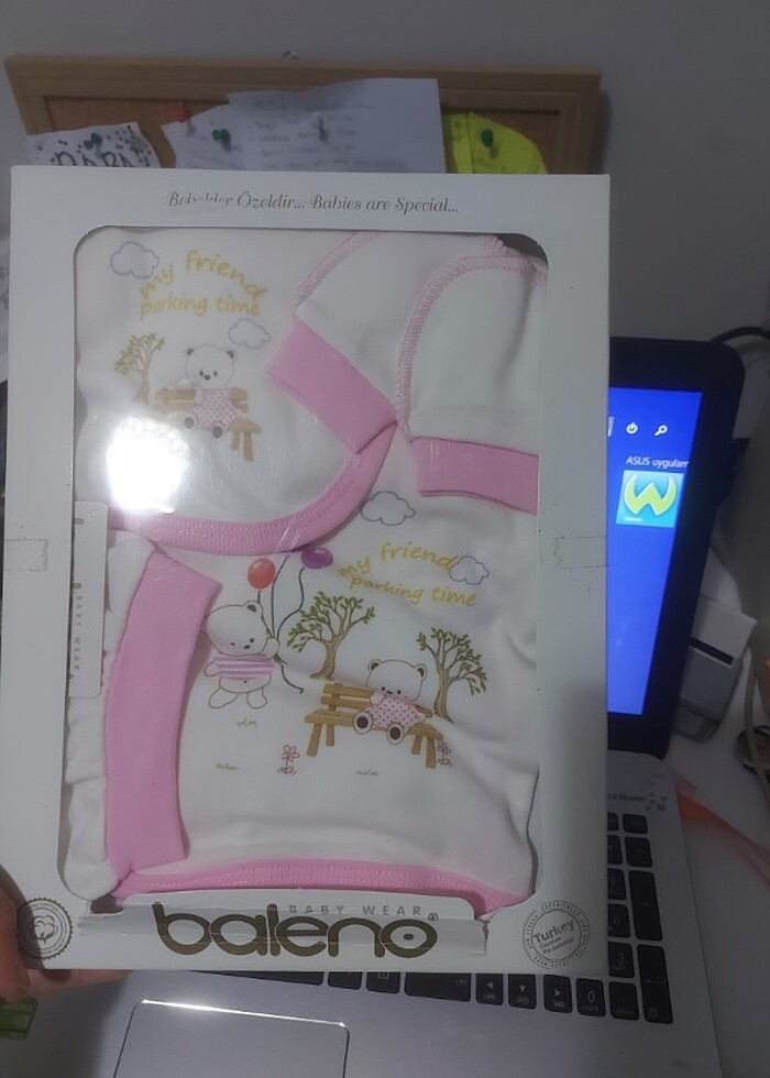 Hediyelik olarak tercih edebileceğiniz, kutu içerisinde eldiven, yakalık, şapka ve patikli alt ve çıtçıtlı üst bulunan bebek yenidoğan takımı