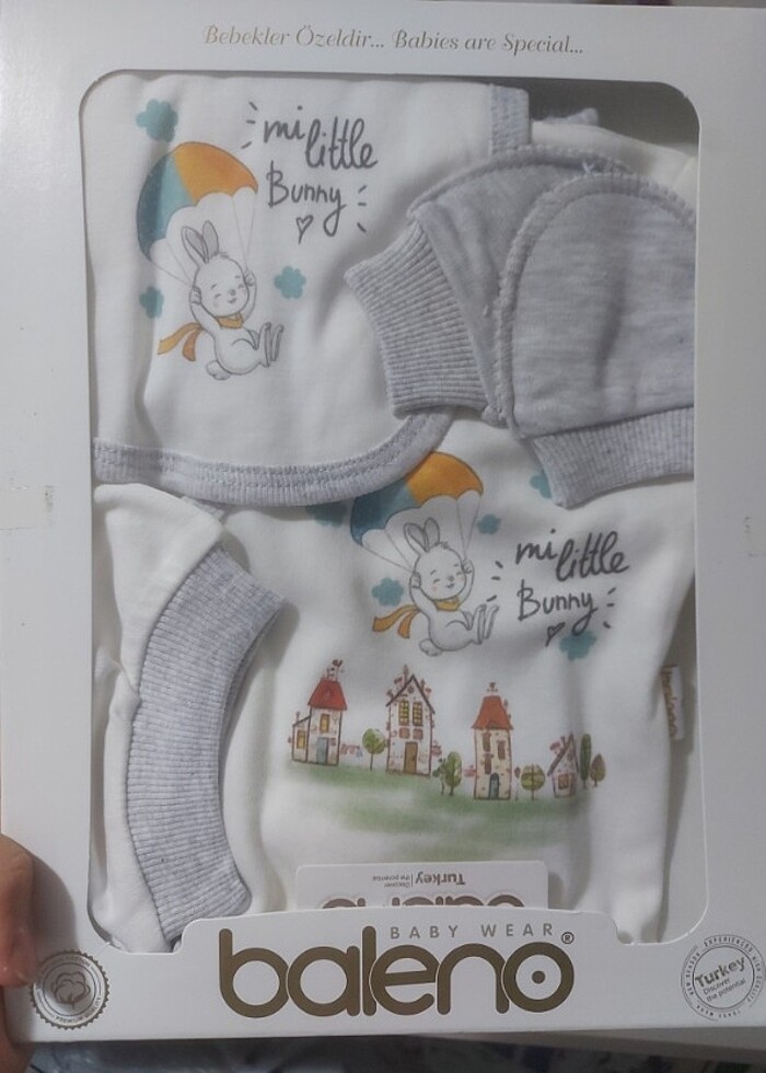 Hediyelik olarak tercih edebileceğiniz, kutu içerisinde eldiven, yakalık, şapka ve patikli alt ve çıtçıtlı üst bulunan bebek yenidoğan takımı