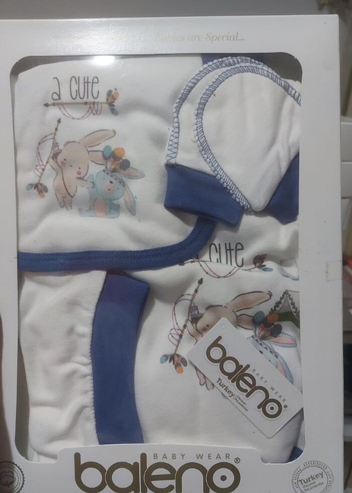 Hediyelik olarak tercih edebileceğiniz, kutu içerisinde eldiven, yakalık, şapka ve patikli alt ve çıtçıtlı üst bulunan bebek yenidoğan takımı