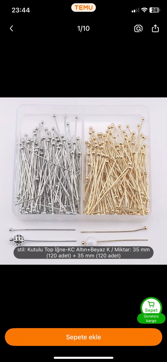 Kutusunda 120 adet altın ve 120 adet beyaz top iğne, her biri 35 mm uzunluğunda. Tırnak süslemeleri ve el işçiliği için uygundur. ✨