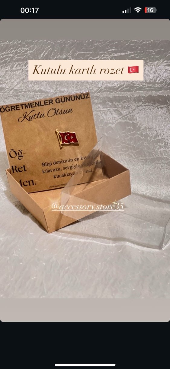 Öğretmenler Günü için kutulu, Türk bayrağı kartlı rozet. Bilgi rehberi ve kucaklayıcı öğretmenlere özel mesaj içerir.