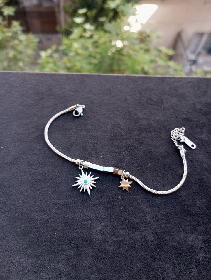 Turkuaz taşlı ve yıldız figürlü küçük detaylara sahip zincir bileklik, minimal ve bohem tarzı yansıtır.