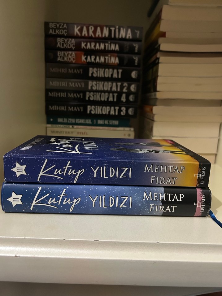 Mehtap Fırat'ın "Kutup Yıldızı" adlı romanından iki adet, yıldızlı gece temalı kapaklarla.