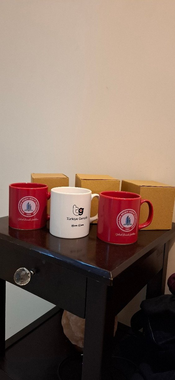 Karton kutularda paketlenmiş kırmızı ve beyaz renkli seramik kupalardan oluşan set. ☕ Adet 100₺.