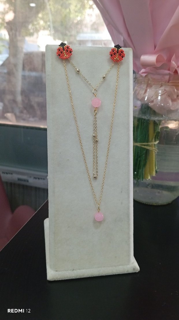 Pembe boncuk detaylı, uzun ve renkli nakışlı kolye, bohem tarzı için uygun. Günlük kullanıma minimal ve retro bir hava katar.