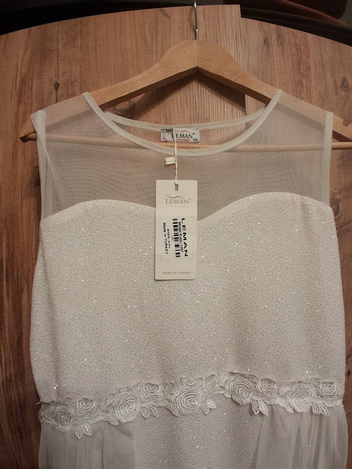 Sırtı tül, dantel detaylı beyaz mini abiye elbise. Yuvarlak yakalı, kolsuz ve vücuda oturan kesimiyle düğünler için uygundur. Kuyrukludur.