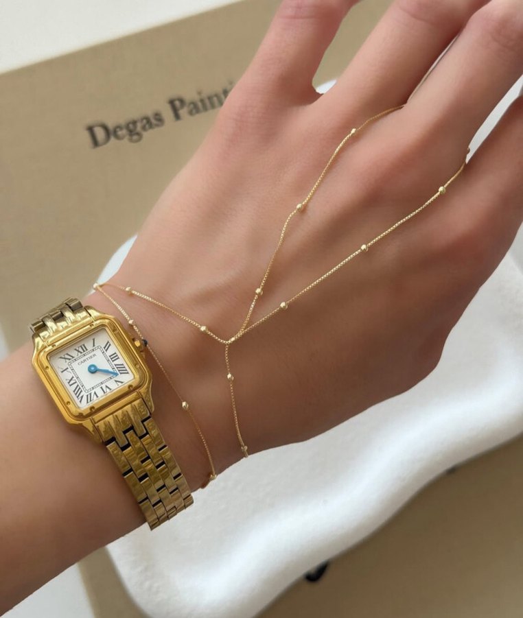 Zarif zincir detaylarına sahip, parlak altın renkli el zinciri. Minimalist ve bohem tarzlara uyumlu, günlük kullanım için ideal. "