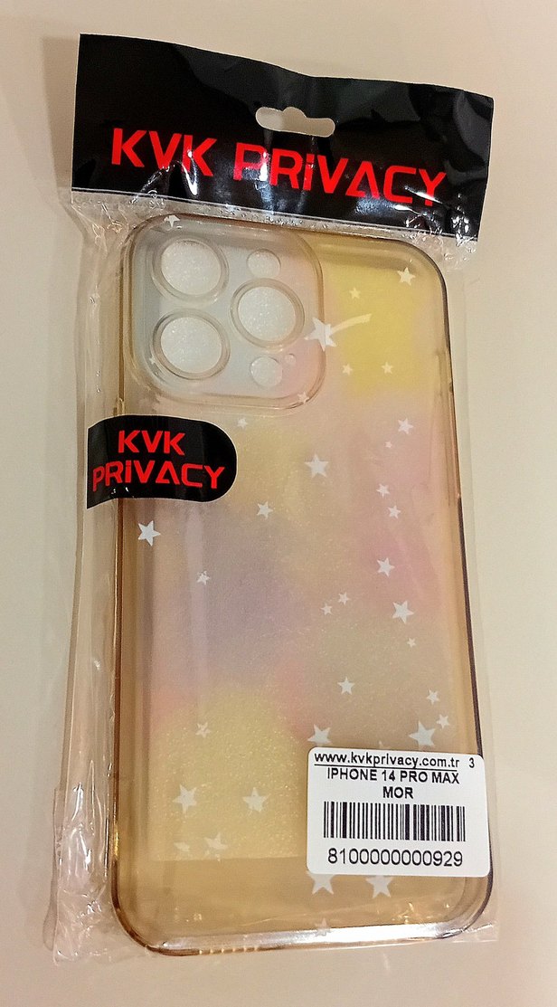 KVK Privacy şeffaf telefon kılıfı, iPhone 14 Pro Max için mor tonlarında çok renkli ve yıldız desenli, streetwear tarzında bir üründür.