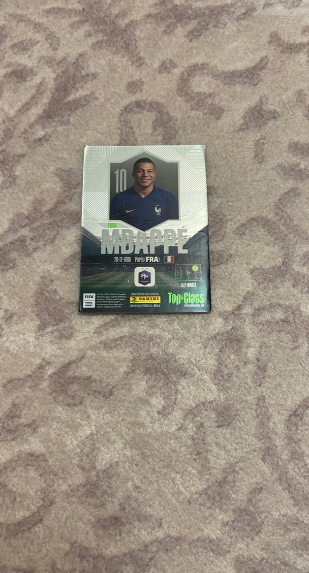 Kylian Mbappé'nin portresi ve istatistikleri ile tasarlanmış koyu gri kart futbol hayranlar için uygundur. ⚽