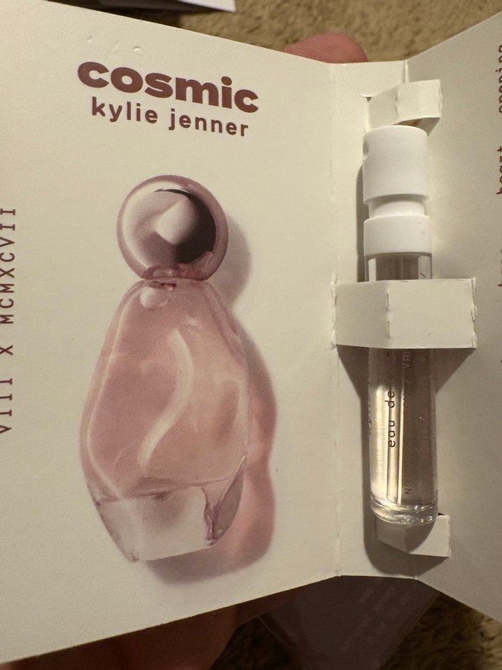 Kylie Jenner Cosmic kadın parfümü örneği, özel şişe tasarımı ve ferah kokusu ile. Küçük sprey şişede sunulur. …