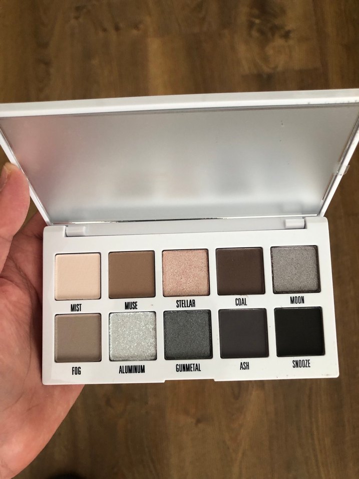 Bej ve gri tonlarda metalik ve mat bitişli göz farı paleti, içinde kül, kömür ve alüminyum renkleri bulunur. ️