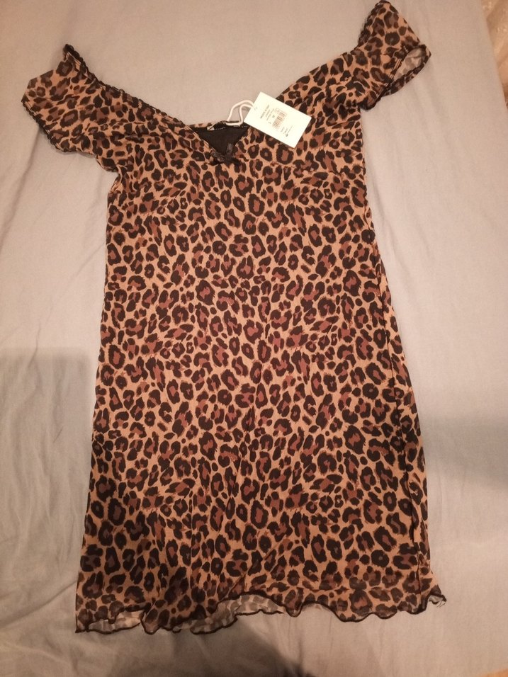 kayık yaka ve kısa kollarda fırfır detaylarına sahiptir. Yumuşak sentetik kumaştan yapılmış, koyu kahverengi leopar desenlidir, romantik akşamlar için uygundur mini elbisedir