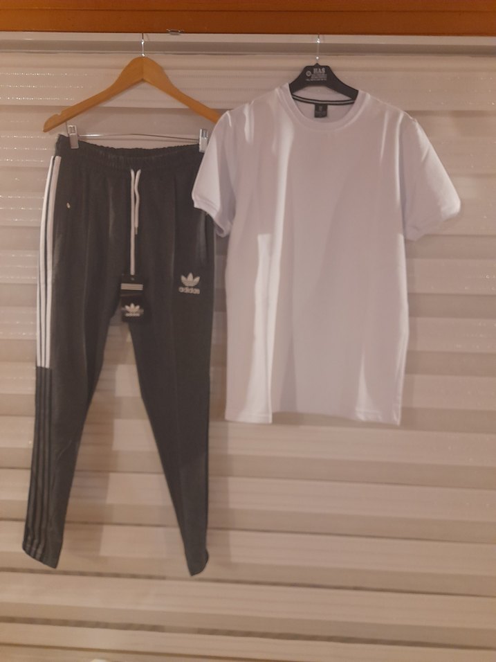L beden beyaz tisortle kombinnolunca takim oluyor Gri renkli, beyaz şerit detaylı bol kesim eşofman altı ve beyaz düz yuvarlak yaka tişört, sentetik kumaştan üretilmiştir. ister tek ister takım olarak alabilirsiniz kesinle diz yapmaz ust ise iki iplik ikiside çok kaliteli ve garantili kumas bay bayan için olur