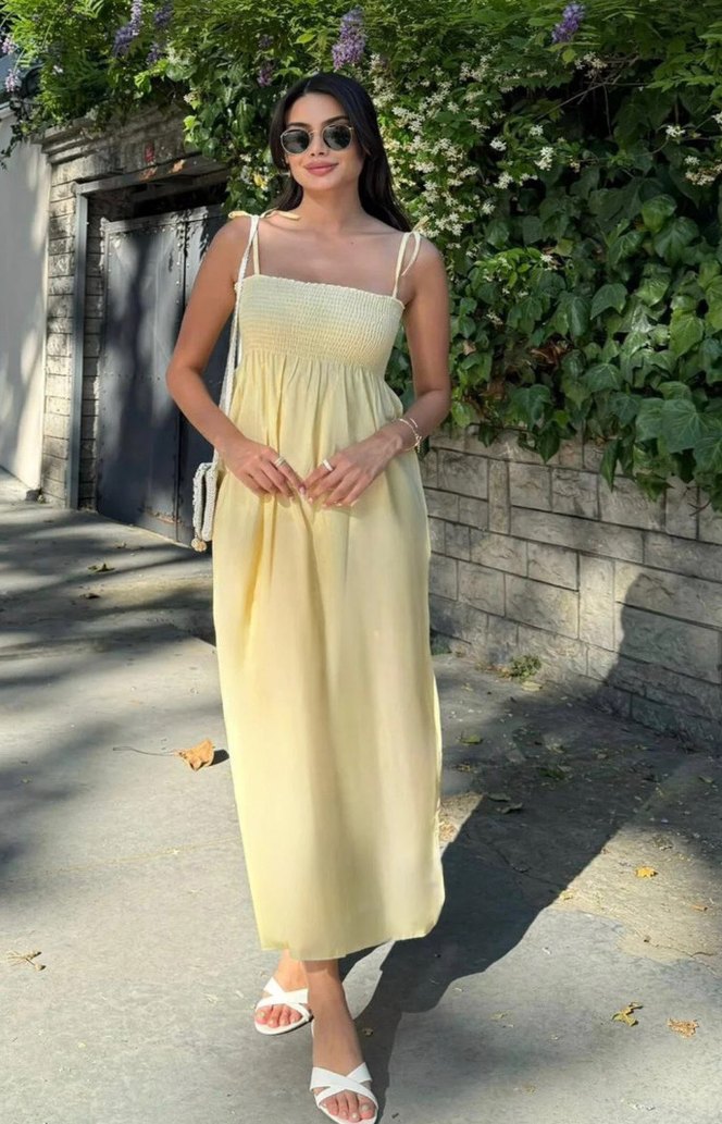 L Beden Pastel Sarı Smoklu Midi Elbise - Sadece 2 Kez Giyildi