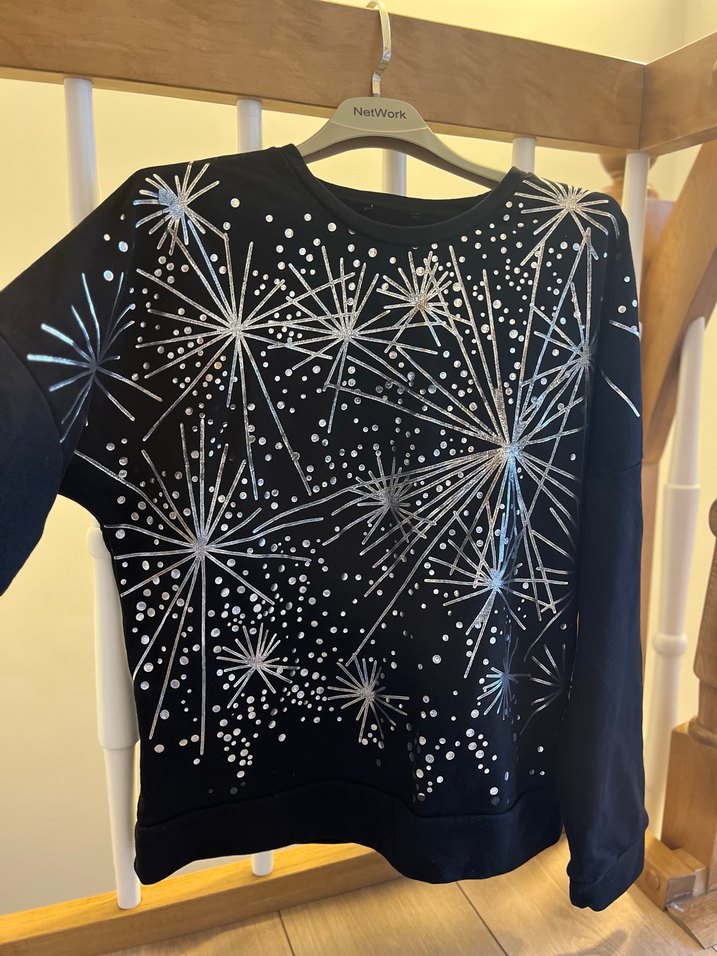L beden Siyah, uzun kollu, yuvarlak yaka, payet işlemeli tişört rahat kesimi ve sokak modası tarzıyla öne çıkar. ✨