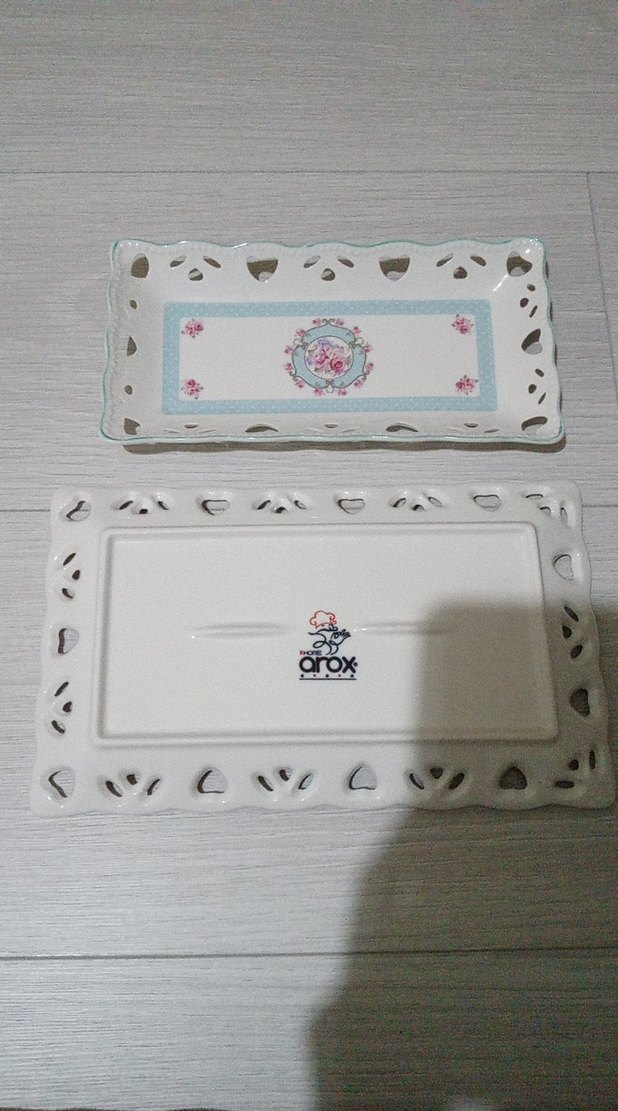 L harfi ve Arox markası bulunan, çiçek desenli ve zarif delikli beyaz pastel yiyecek kapları seti. ️