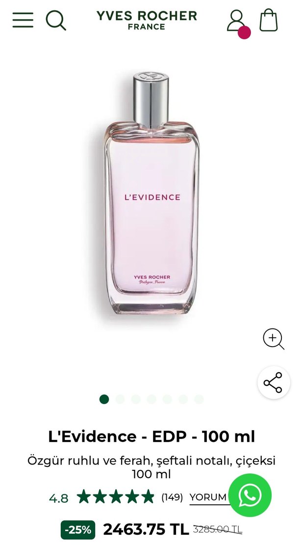 L'Evidence kadın parfümü, özgür ruhlu ve ferah bir kokuya sahip, şeftali ve çiçeksi notalar içerir, 100 ml şişede sunulur. 2-3 kere sıktım.