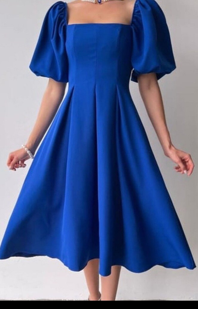 L, XL, XXL beden mevcutMavi midi boy, tek renk, kısa kollu, balıkçı yaka ve pileli modern klasik elbise. Rahat kesim ve parlak kumaş, ofis için uygun.