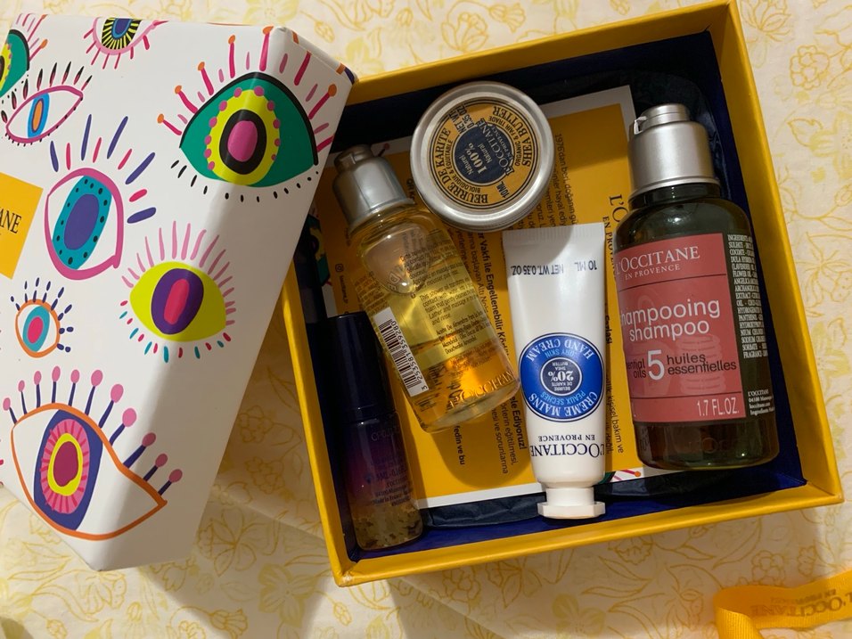 L'Occitane bakım seti, el kremi, şampuan ve diğer kişisel bakım ürünlerini içeren dekoratif kutuda sunulur.
