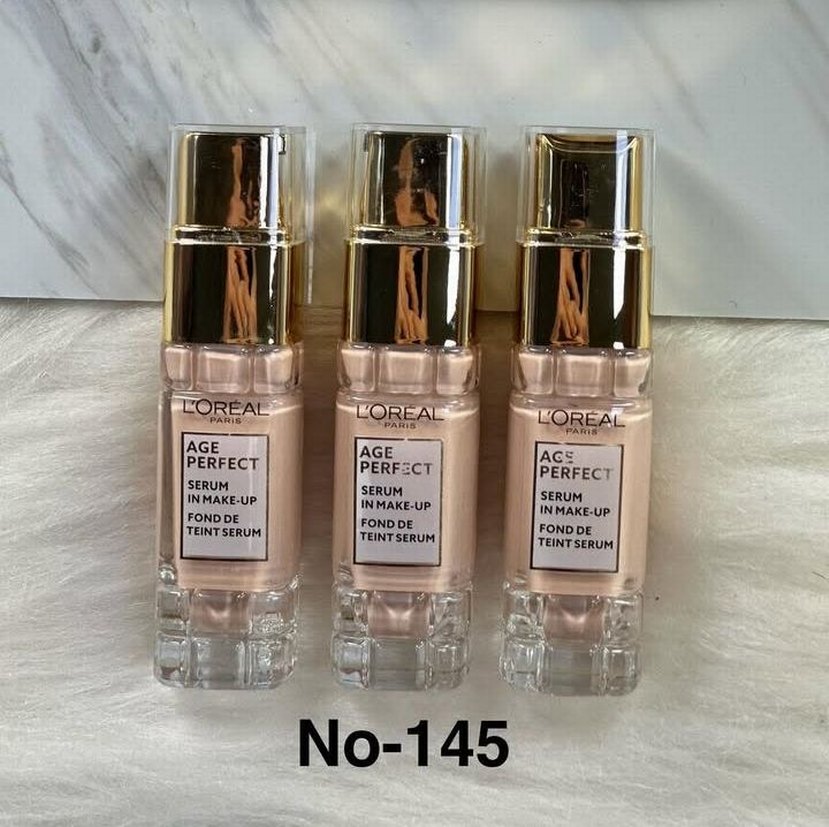 L'Oréal Age Perfect serum fondöten, parlak bej No-145 rengi ile pürüzsüz ve ışıltılı bir görünüm sağlar.