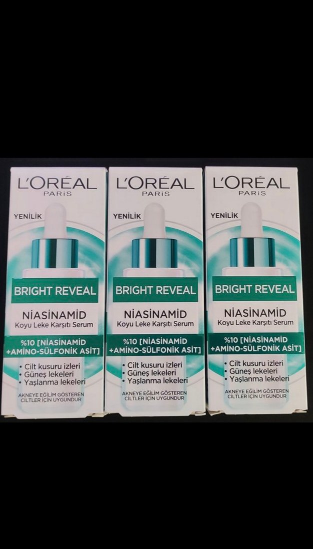 3 adet sıfır L'Oréal Bright Reveal serumu %10 niasinamid ve amino-sülfonik asit içerir, koyu lekeler, güneş lekeleri ve cilt kusurlarına karşı etkilidir. Tüm cilt tiplerine uygundur.
