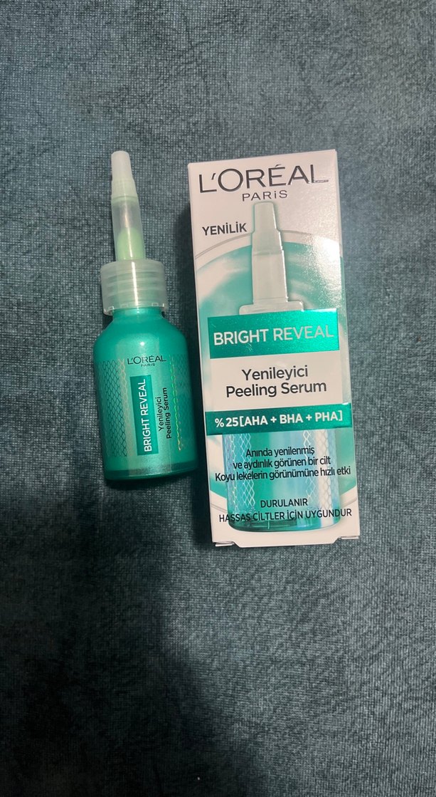 L'Oréal Bright Reveal Peeling Serum, %25 AHA, BHA ve PHA içerir. Cildi yenileyip aydınlatır, hassas ciltler için uygundur, durulanır. Hiç kullanılmadı. Paketi açılmadı