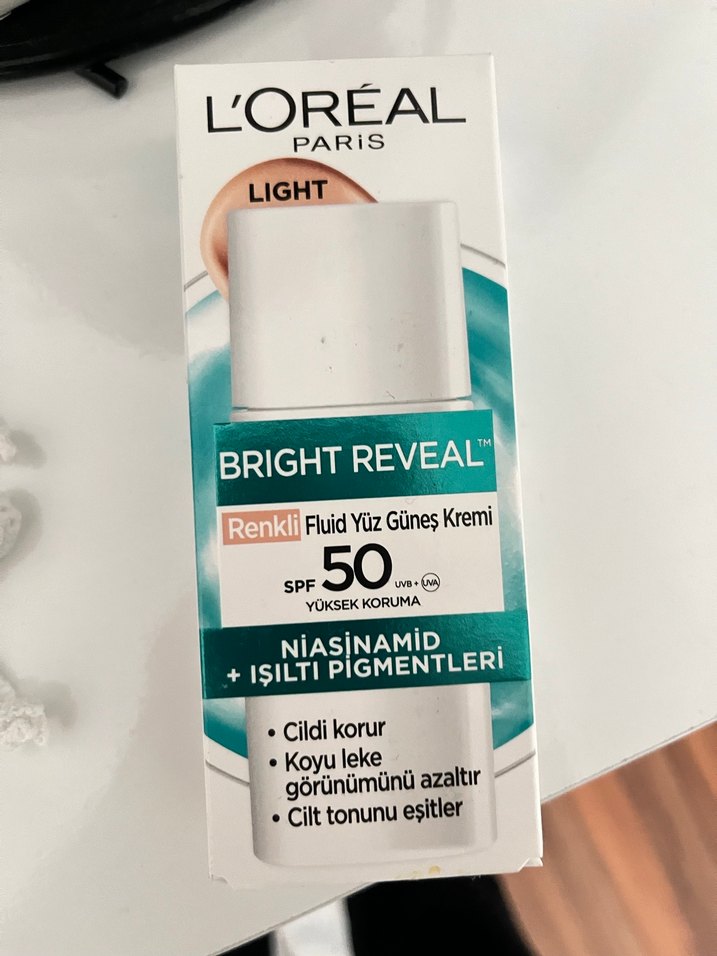 L'Oréal Bright Reveal renkli yüz güneş kremi SPF 50 ile yüksek koruma sağlar, cilt tonunu eşitler, koyu leke görünümünü azaltır, niasinamid ve ışıltılı pigmentler içerir. ☀️