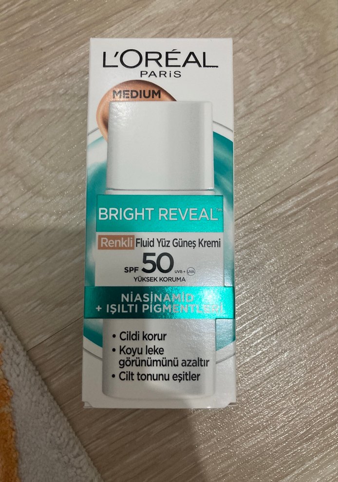 L'Oréal Bright Reveal renkli yüz güneş kremi SPF 50 ile yüksek koruma sağlar. Cilt tonunu eşitler, koyu leke görünümünü azaltır ve cildi korur. Sadece denedim tenime uymadı