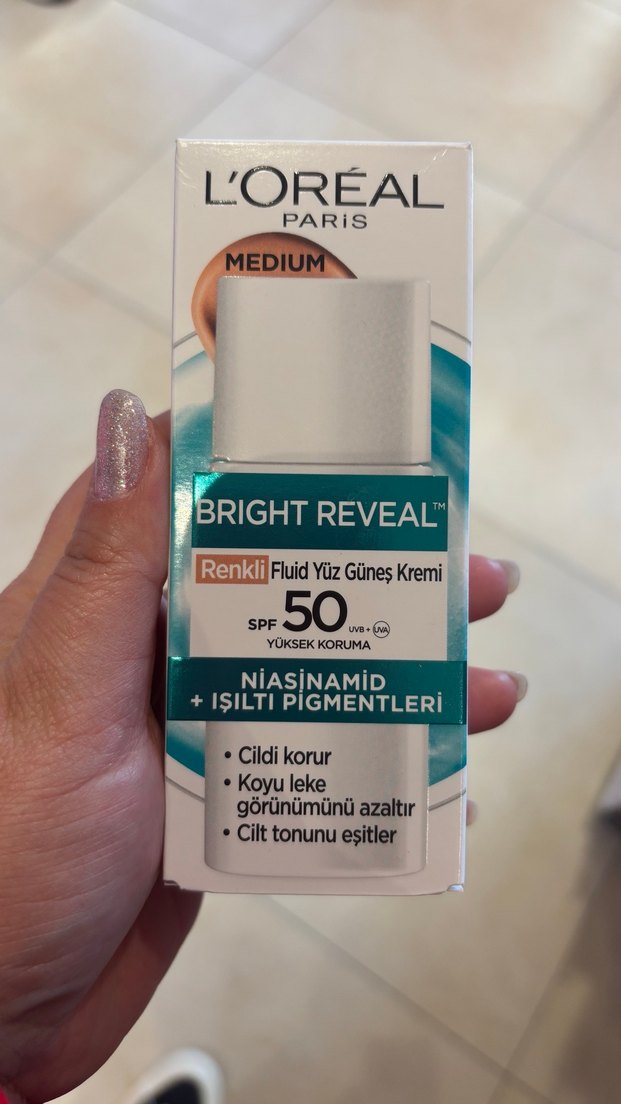 Sadece bir kere kucuk damla denendı . L'Oréal Bright Reveal renkli yüz güneş kremi SPF 50 ile yüksek koruma sağlar. Niacinamide ve ışıl pigmentler içerir, cildi korur, koyu leke görünümünü azaltır ve cilt tonunu eşitler. Medium ton.