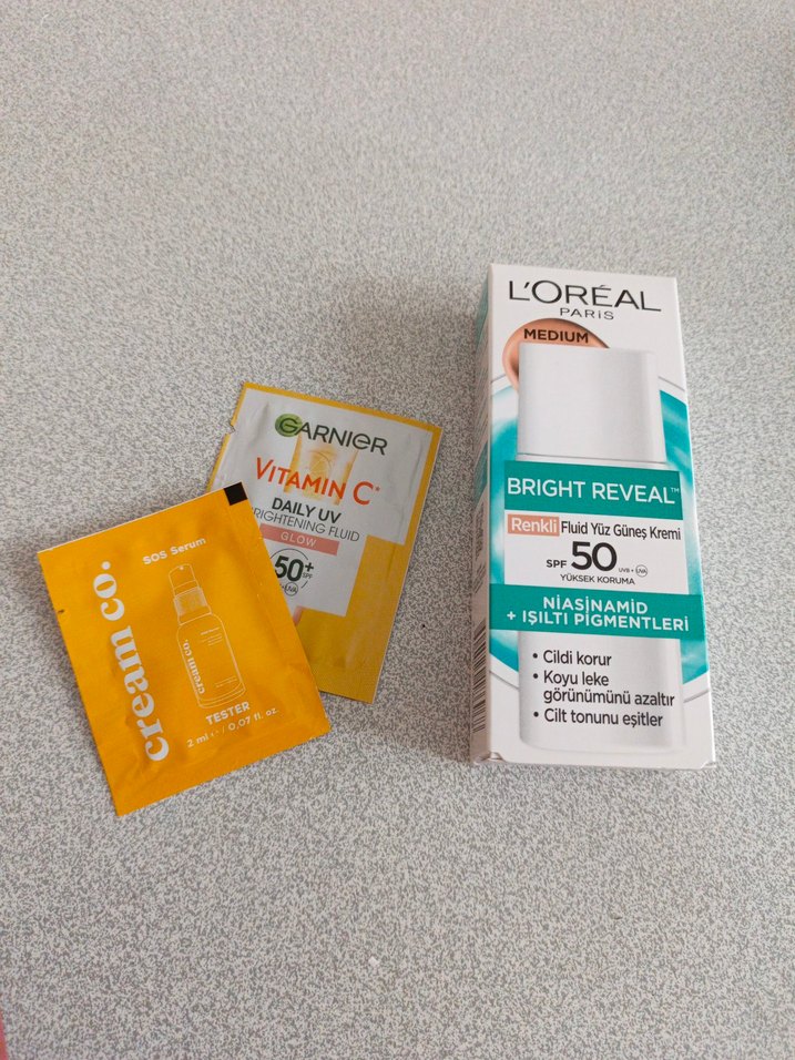 L'Oréal Bright Reveal SPF 50 renkli sıvı güneş kremi, niasinamid ile cildi korur, koyu leke görünümünü azaltır ve cilt tonunu eşitler. ☀️ hic acilmadi 2- 3 ay once aldim renkli oldugu icin kullanmadim