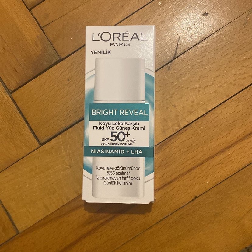 L'Oréal Bright Reveal SPF 50+ güneş kremi, niasinamid ve LHA ile koyu lekeye karşı koruma sağlar. İz bırakmayan hafif dokuludur, günlük kullanım içindir. ☀️