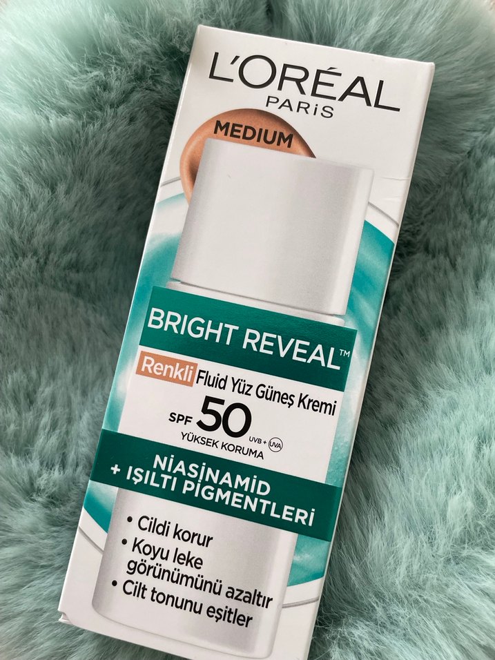 L'Oréal Bright Reveal SPF 50 renkli yüz güneş kremi, cilt tonunu eşitler, cildi korur, koyu leke görünümünü azaltır, niasinamid ve ışıltı pigmentleri içerir. ☀️