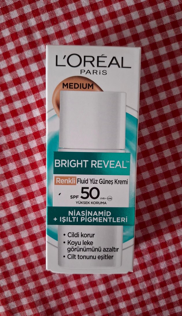 L'Oréal Bright Reveal renkli yüz güneş kremi SPF 50 koruma sağlar. Niasinamid ve ışılti pigmentleri ile cildi korur, ton eşitler, koyu leke görünümünü azaltır. Hediye geldi rengi uymadığı için hiç kullanmadım.