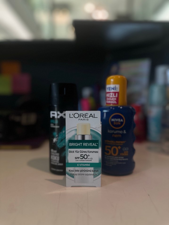 L'Oréal Bright Reveal yüz güneş koruyucu stick SPF 50+ ve E vitamini içerir. Koyu leke görünümüne karşı koruma sağlar. Pratik kullanımlı. •50+ faktör koruma sprey güneş kremi •axe deodorant •nişan bohçası için alınmıştı hiç kullanılmadı