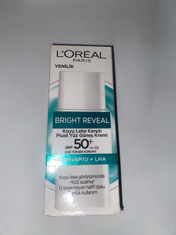 L'Oréal Bright Reveal yüz güneş kremi SPF 50+ koruma sağlar, hafif dokuludur. Koyu lekeleri %53 azaltır, niasinamid ve LHA içerir. İz bırakmaz, günlük kullanıma uygundur. ☀️ Cilt tipime uygun değildi. Sadece bir kere kullandım.