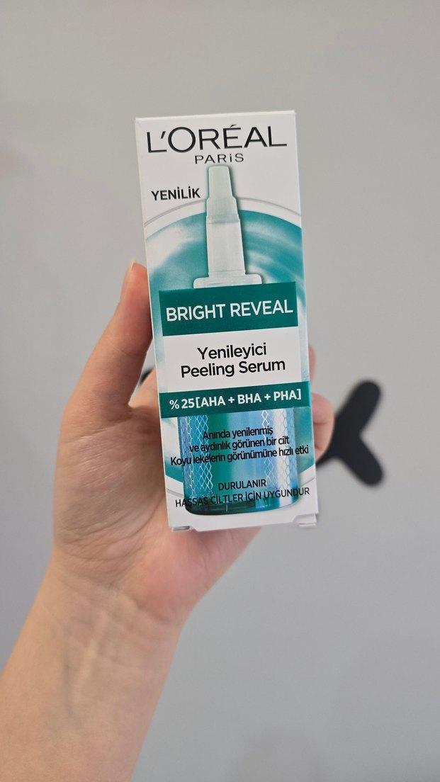 L'Oréal Bright Reveal Peeling Serumu %25 AHA, BHA ve PHA içerir, cildi yeniler ve aydınlık görünüm sağlar. Durulanır, hassas ciltlere uygundur. ✨