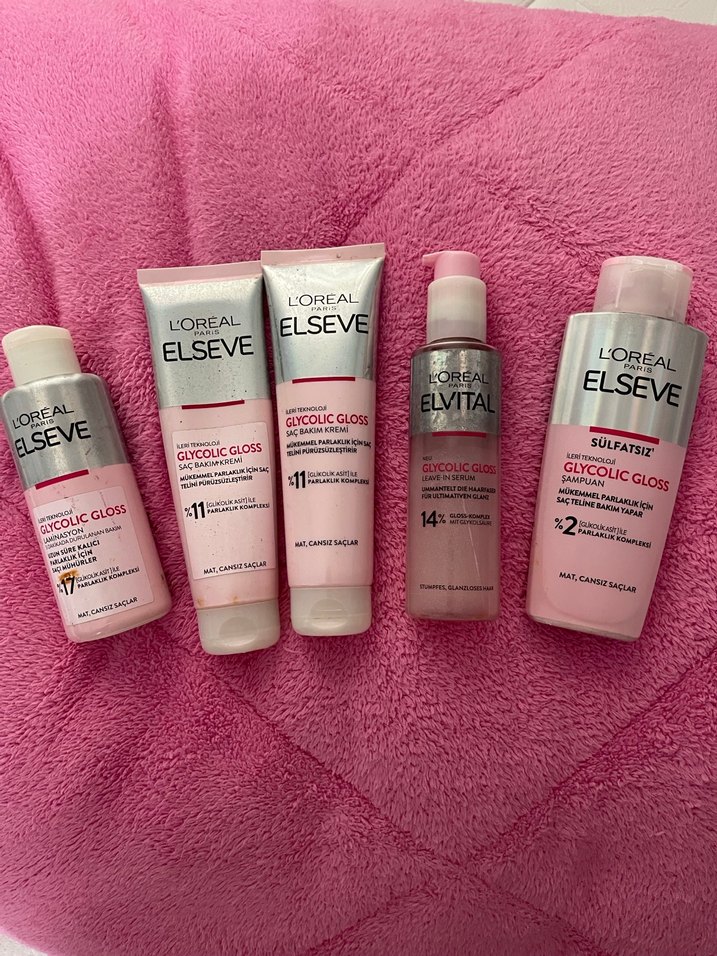 L'Oréal Elseve Glycolic Gloss saç bakım seti, parlaklık ve yumuşaklık için glikolik asit içeren şampuan, saç kremi ve bakım ürünlerinden oluşur. ✨