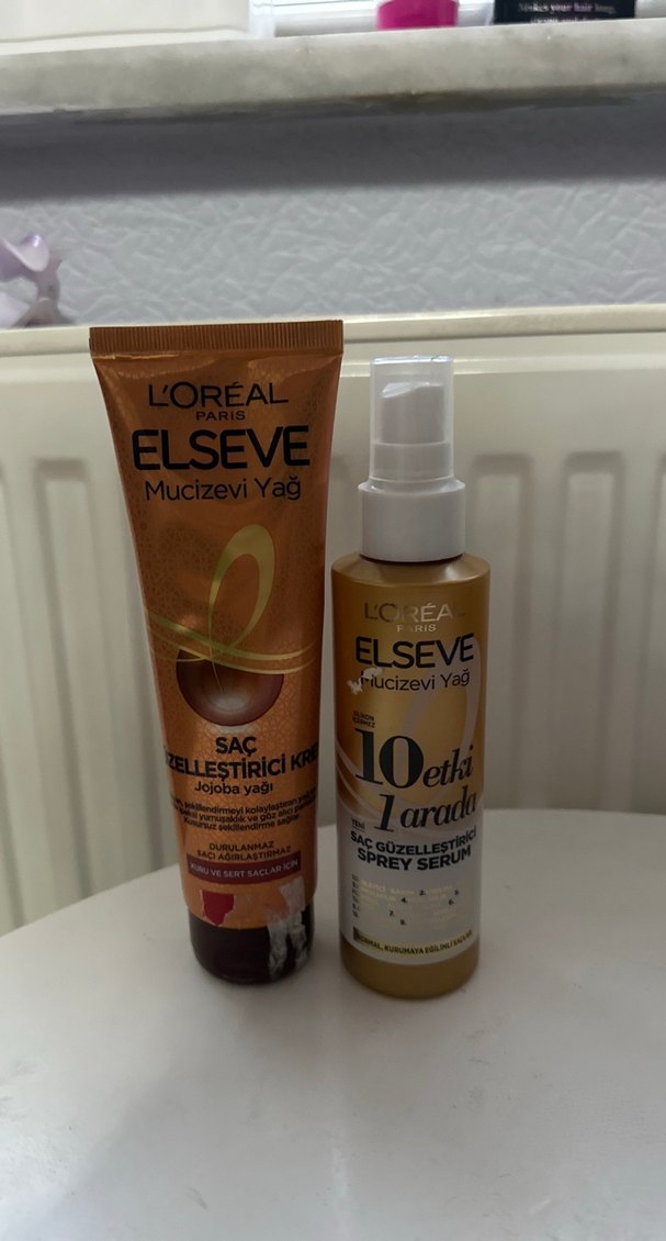 L'Oréal Elseve Mucizevi Yağ saç güçlendirici krem ve güzelleştirici sprey serum içerir. Kuru ve mat saçlar için uygundur. kremi hiç kullanmadım sıvı olan yarıda yarıdan biraz daha fazla yada