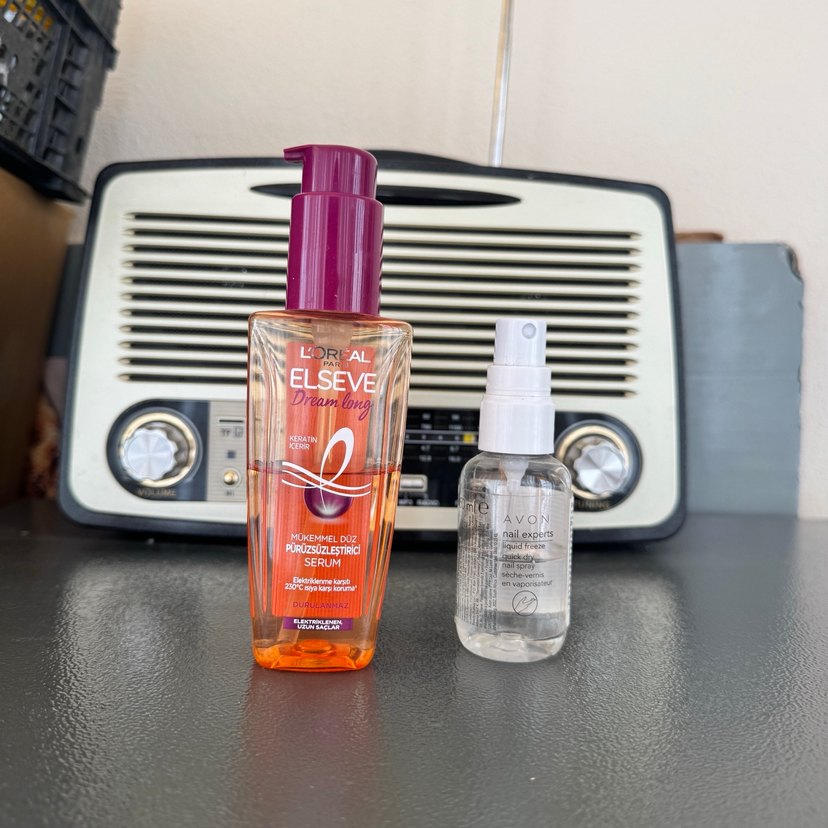 L'Oréal Elseve Dream Long keratin içeren saç serumu, saçı pürüzsüzleştirir ve korur. Pompalı şişe ile kolay kullanım sağlar. ♀️ve Avon oje kurutucu. Her ikisi de yarım kullanımıştır
