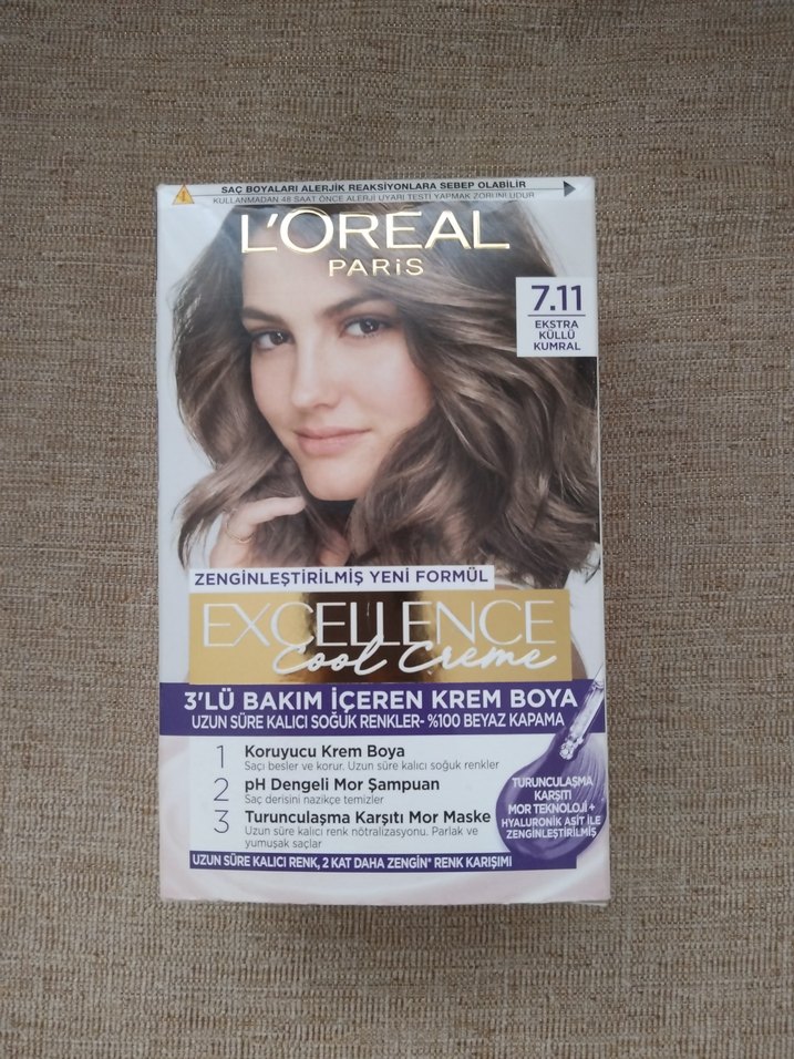 L'Oréal Excellence Cool Creme 7.11 saç boyası, uzun süre kalıcı renk verir. Koruyucu krem boya, pH dengeli mor şampuan ve turunculaşma karşıtı maske içerir. Sıfır ürün.