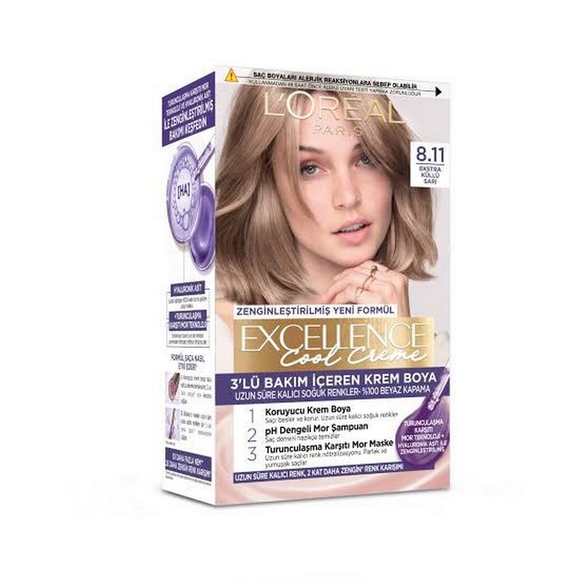 L'Oréal Excellence Cool Creme 8.11 saç boyası, koruyucu krem boya, pH dengeli mor şampuan ve turunculaşmaya karşı mor maske ile uzun süre kalıcı soğuk sarı renk sağlar.