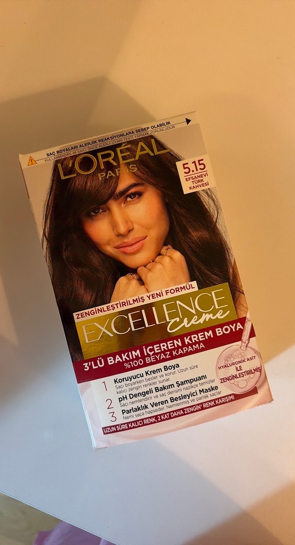 Loreal Excellence Creme 5.15 saç boyası, koruyucu krem, pH dengeli bakım şampuanı ve besleyici maske ile 3'lü bakım sunar. %100 beyaz kapama sağlar.
