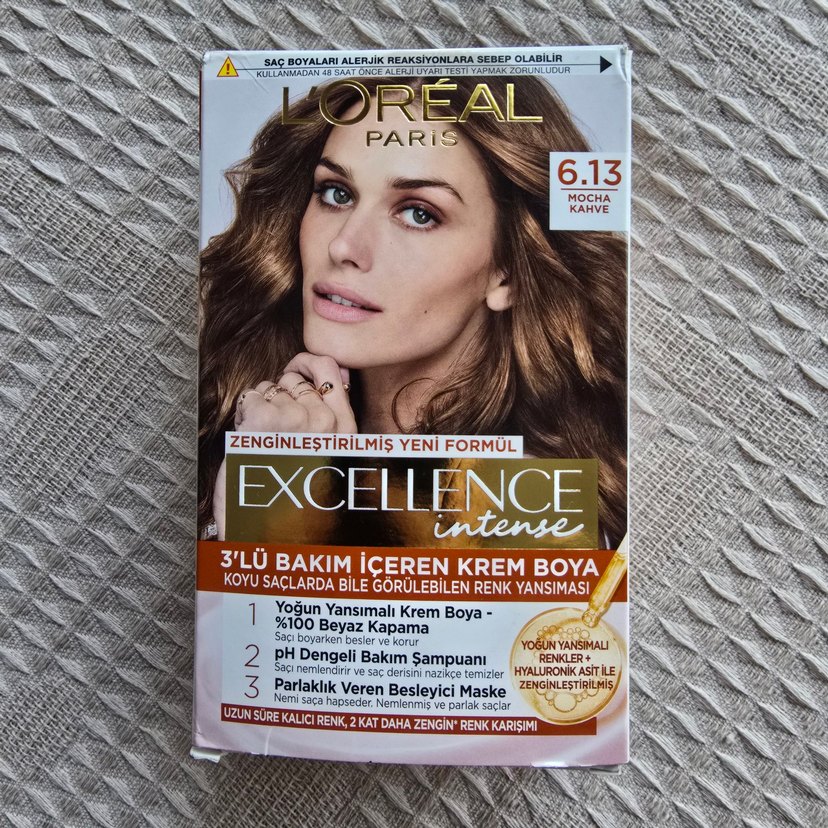 L'Oréal Excellence Intense 6.13 Mocha Kahve krem saç boyası, %100 beyaz kapama sağlar. Yoğun yansımalar ve hyaluronik asit içeren besleyici maske ile saçları besler. Üçlü bakım sistemi ile saçlar parlak ve sağlıklı kalır. elimde isteğe gore 2 adet mevcuttur