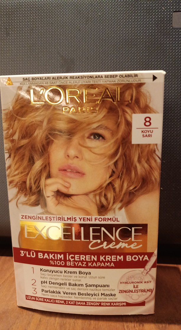 L'Oréal Excellence 8 koyu sarı krem saç boyası %100 beyaz kapama sağlar, koruyucu krem formülü ve pH dengeli bakım şampuanı içerir, hyaluronik asit ile zenginleştirilmiştir. ♀️