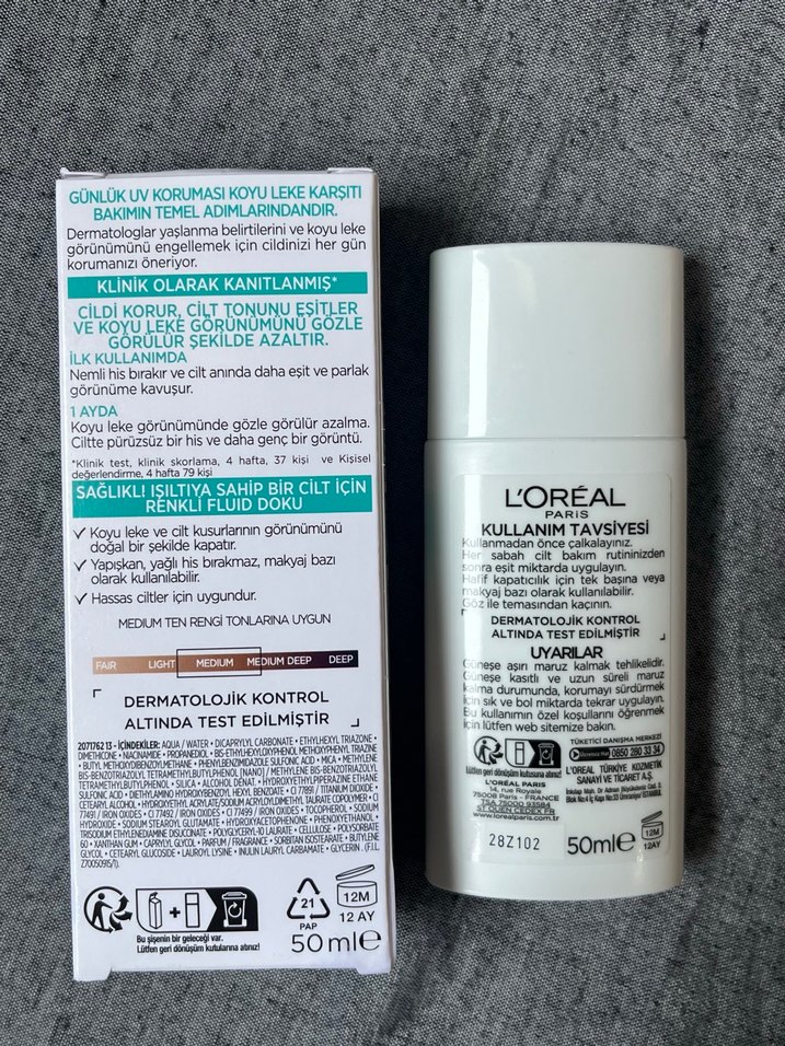 Yanlış rengini aldım ve hiç kullanılmadı ürün orijinaldir tekliflere açığım L'Oréal güneş koruyucu, günlük UV koruması ile koyu lekeleri azaltır ve cilt tonunu eşitler. Dermatolojik olarak test edilmiştir, hassas ciltler için uygundur. 50 ml.